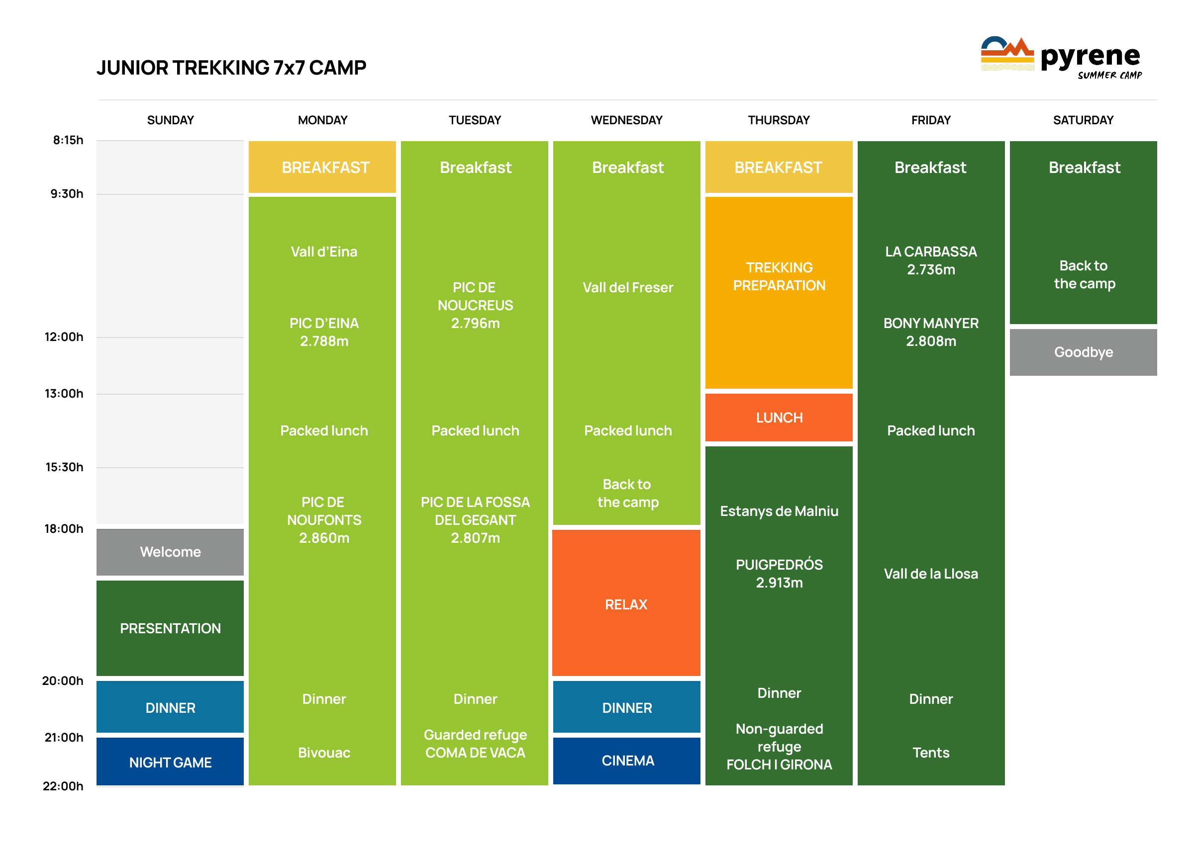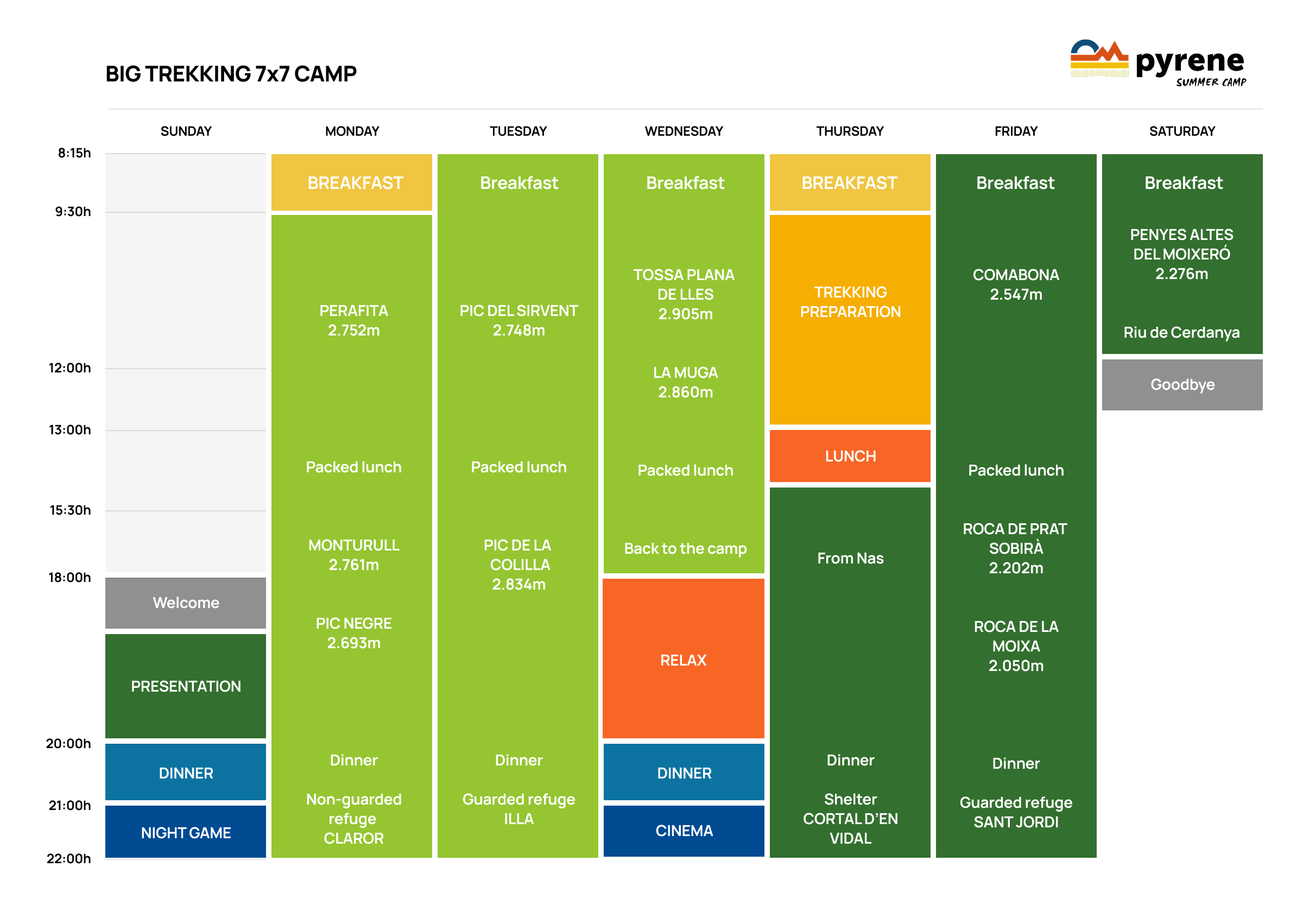 Fly high and reach 7 peaks in 7 days: from the Sustainable Campsite we’ll start our trek which will lead us to iconic peaks in la Cerdanya and neighbouring regions: Puigpedrós, Bony Manyer, Carlit, Peric, Coma d’Or, Puigmal, Tossa Plana de Lles, Perafita or Pedraforca.
